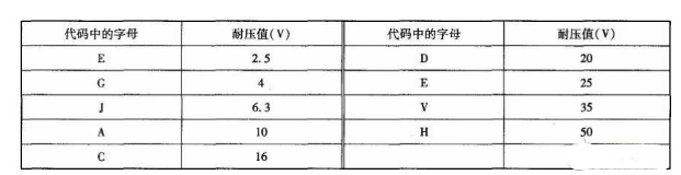 ③使用代碼法,通常由一個字母和三個數(shù)字組成,字母表示電解電容的耐壓值,數(shù)字用來標明電容量,單位為pF。前兩位數(shù)字表示電容量的有效數(shù)字,第三位數(shù)字表示有效數(shù)字乘以10的冪次。貼片電解電容上面的指示條標明此端為電解電容的正極。貼片電解電容代碼中的字母與耐壓值的關系見下表。